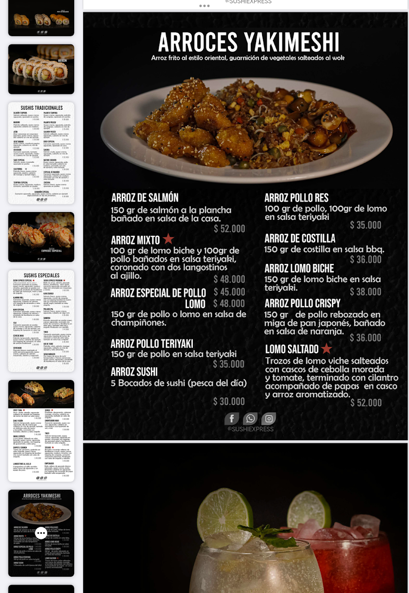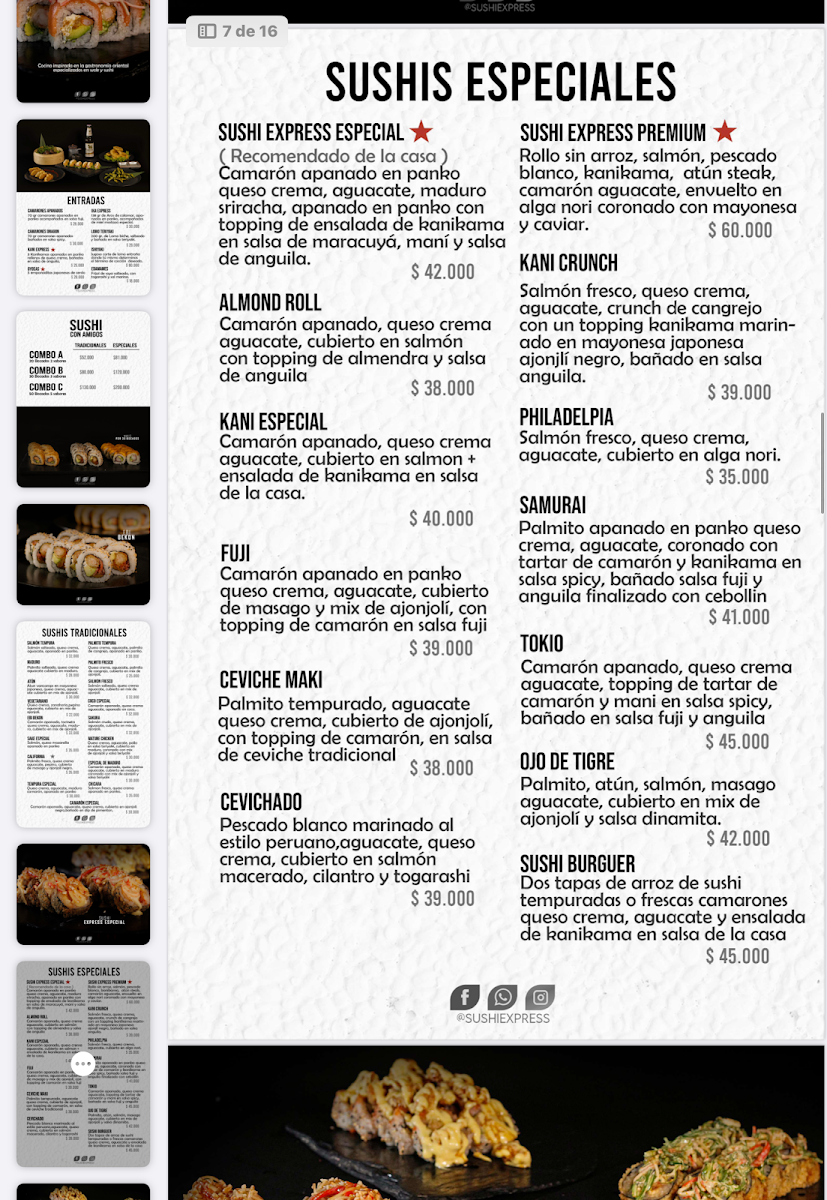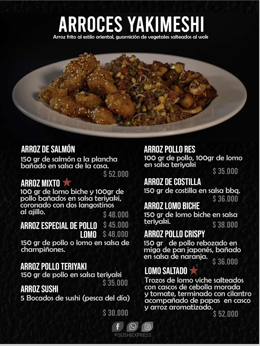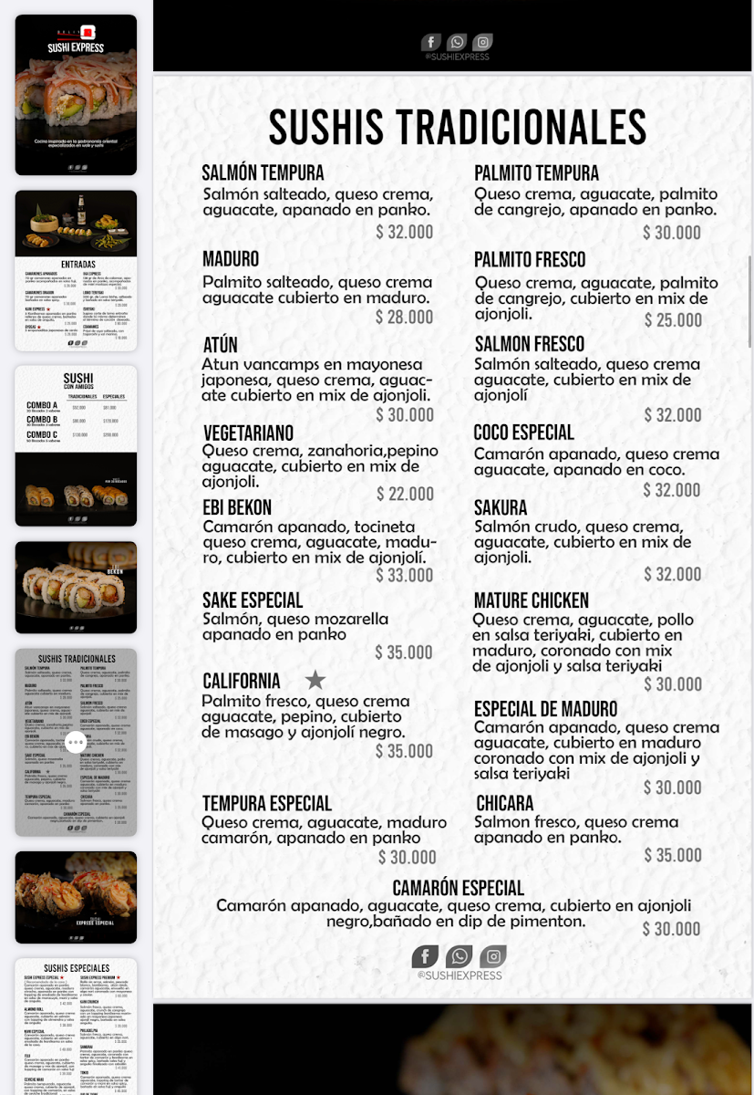 Welcome to Sushi expres Popayan, a hidden gem nestled in Carrera 7#17N-35, Barrio el Recuerdo, Popayan. This restaurant offers a delightful fusion of traditional sushi and culinary creativity. The menu features an impressive array of sushi options, including the Sake Especial with salmon and crispy mozzarella or the fresh California Sushi, each priced at COP 29,000. For those seeking something hearty, the Mature Chicken Sushi delivers ten mouthwatering pieces at COP 26,000.