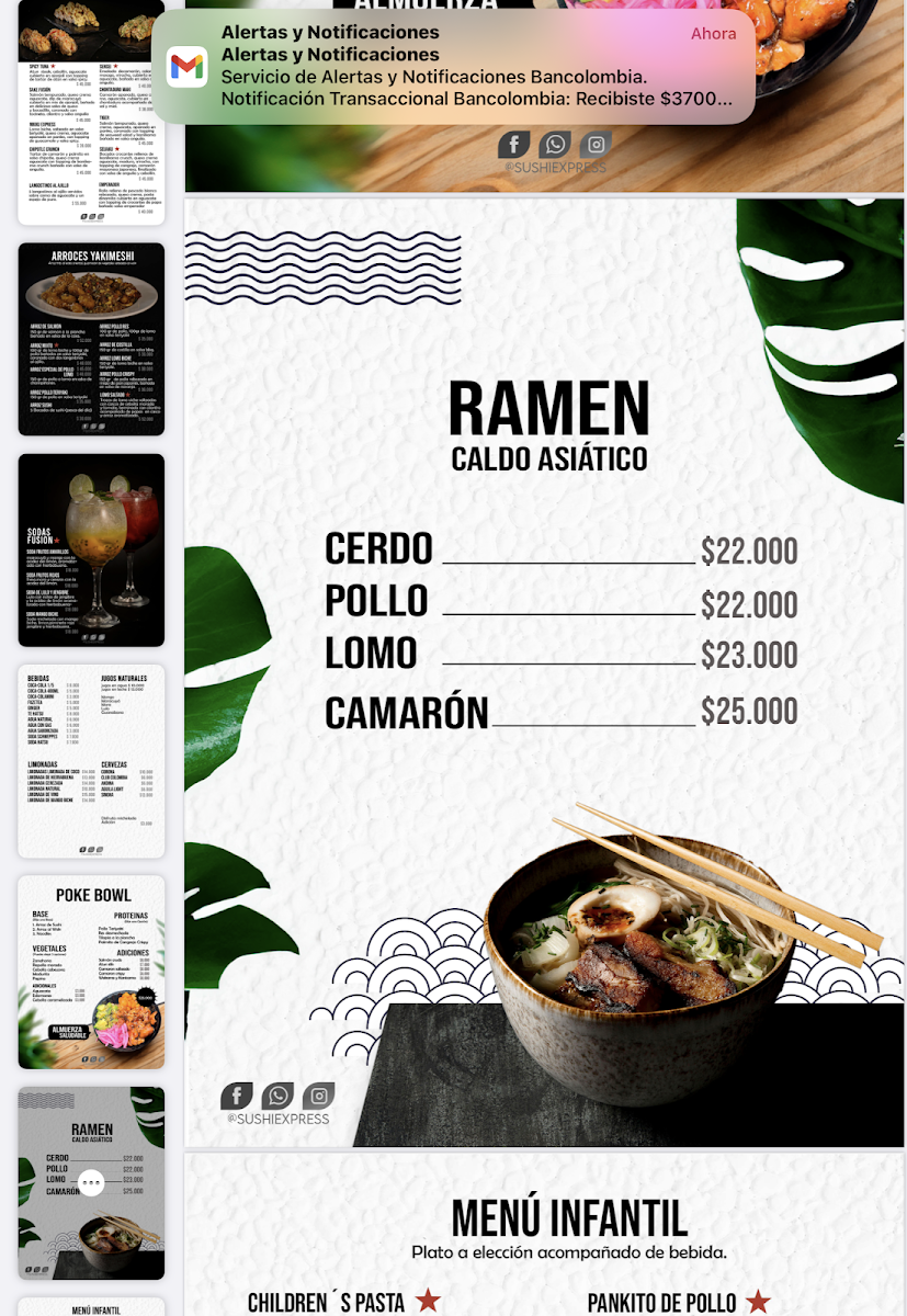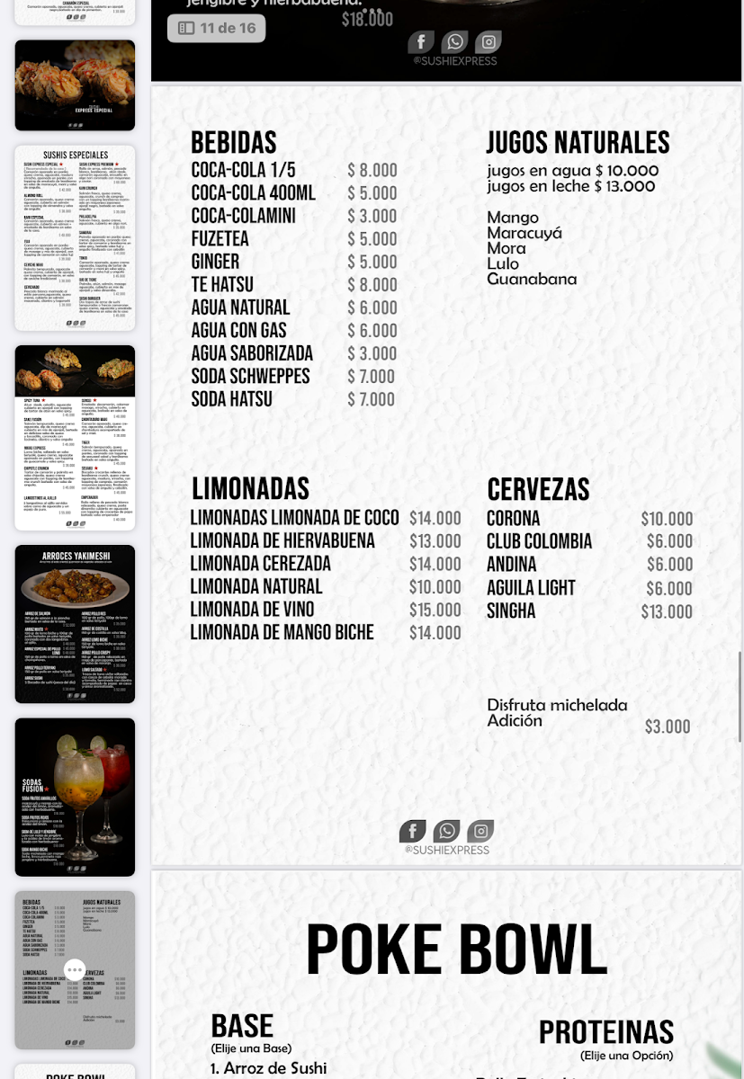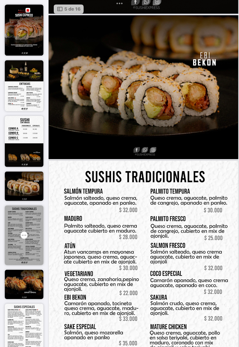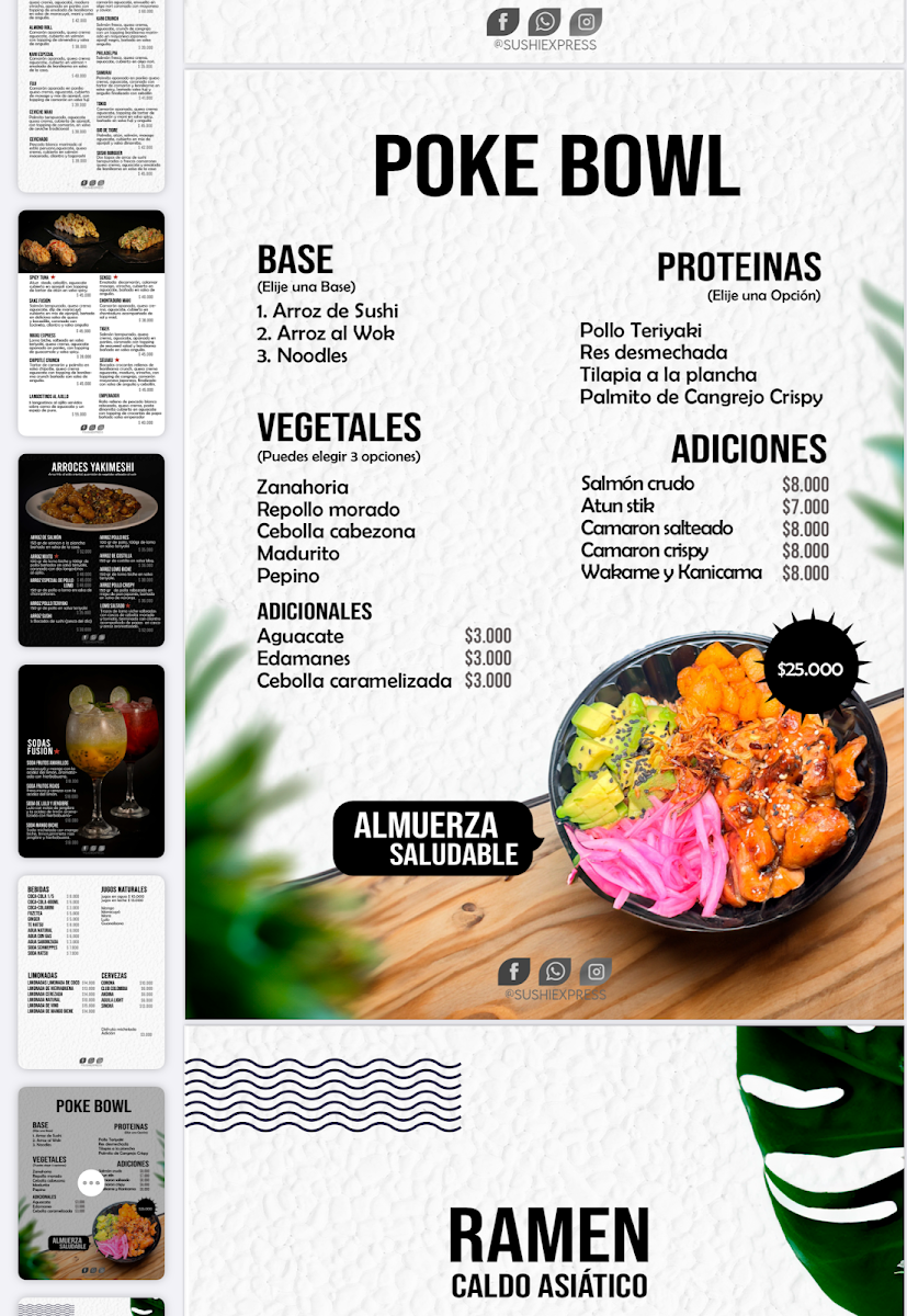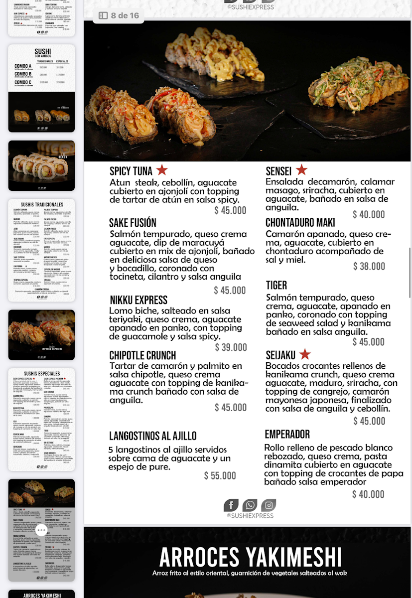 Welcome to Sushi expres Popayan, a hidden gem nestled in Carrera 7#17N-35, Barrio el Recuerdo, Popayan. This restaurant offers a delightful fusion of traditional sushi and culinary creativity. The menu features an impressive array of sushi options, including the Sake Especial with salmon and crispy mozzarella or the fresh California Sushi, each priced at COP 29,000. For those seeking something hearty, the Mature Chicken Sushi delivers ten mouthwatering pieces at COP 26,000.